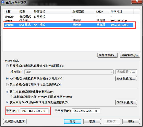 RX bytes:0 (0.0 b) TX bytes:0 (0.0 b)网卡的配置已经被应用到了,我们CentOS的IP是 192.168.100.128 你的可能和我不一样,那这个192.168.100开头的网段是在哪里设置的呢?